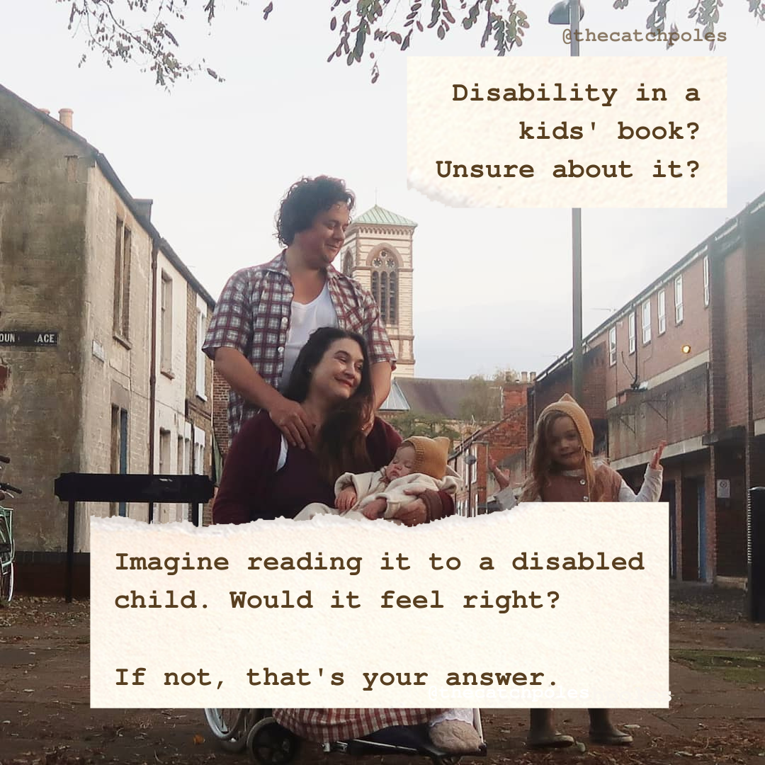 - A photo of Lucy, James, Mainie & Viola outside in Jericho. Lucy’s a wheelchair user, and you can’t actually see that James has one leg here – but he has. Viola is a baby and asleep. All subsequent images use the same photo as background, just the text changes. Our text reads: ‘Disability in a kids’ book? Unsure about it? Imagine reading it to a disabled child. Would it feel right? If not, that’s your answer.’