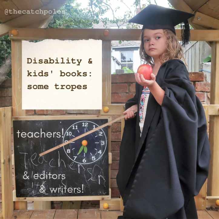 Image 1: Mainie, our 6yo daughter, is pretending to be a teacher. She’s holding an apple and pointing at her blackboard with a stick. She’s wearing James’s old academic cap and gown. (Truth be told it fell off constantly and I am amazed we got this one shot.) Our text, on a cream paper background, reads: ‘Disability and kids’ books: some tropes’. On the blackboard are the words ‘teachers!’ ‘& editors & writers!’. (If you look very closely, Mainie has written the word ‘teachers’ too. It’s gloriously lopsided.)