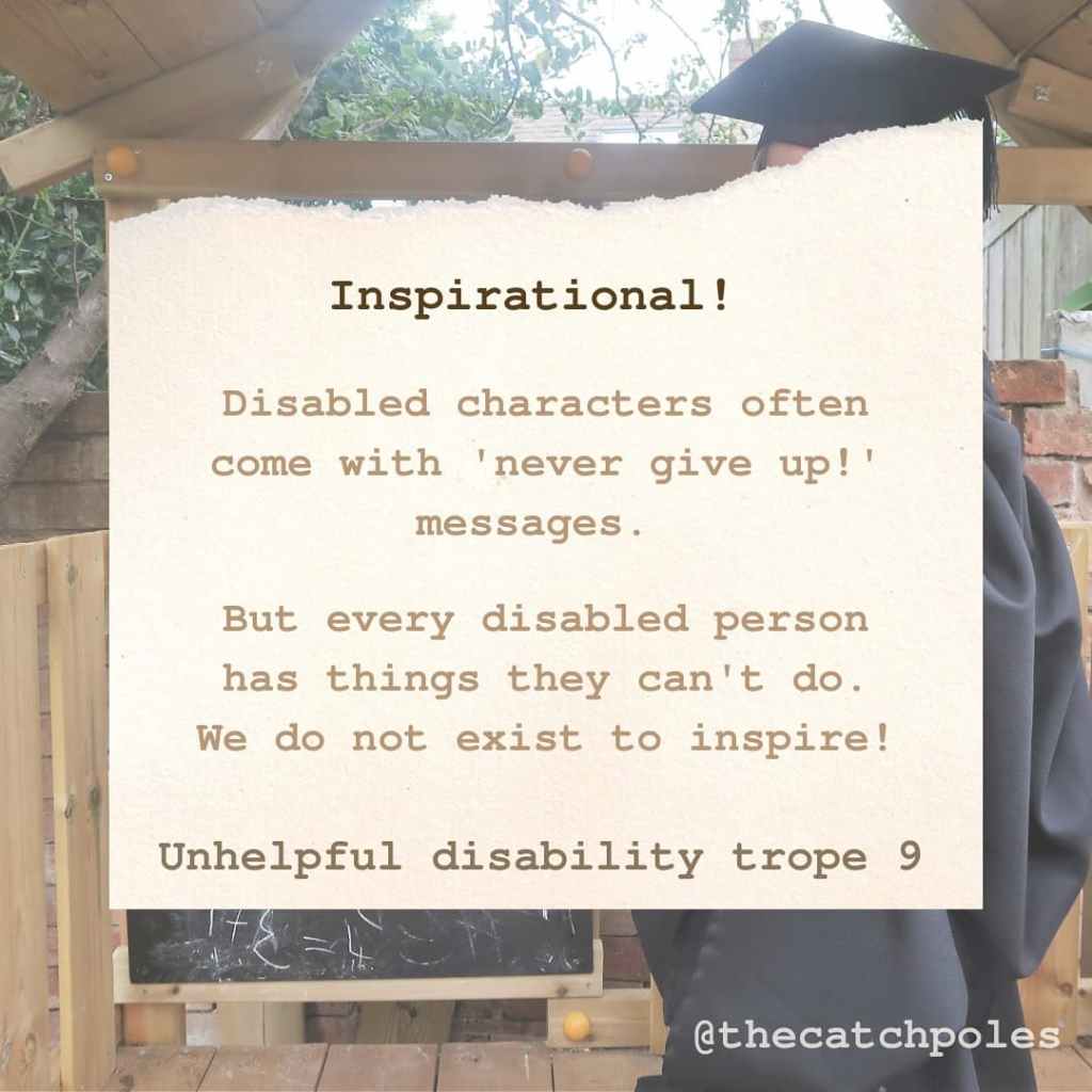 Image 10: ‘Inspirational! Disabled characters often come with ‘never give up!’ messages. But every disabled person has things they can’t do. We do not exist to inspire! Unhelpful disability trope 9′]