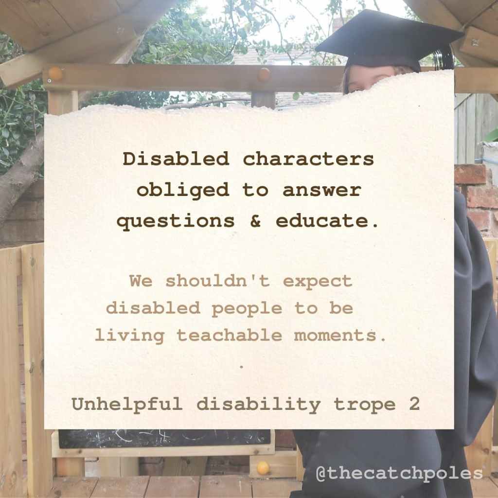 Image 3: Our text reads: ‘Disabled characters obliged to answer questions & educate. We shouldn’t expect disabled people to be living teachable moments. Unhelpful disability trope 2’