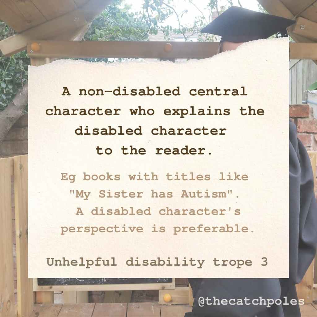 • A non-disabled central character who explains the disabled character to the reader. Eg books with titles like “My Sister has Autism”. If you imagine we were talking about characters of different races, you can probably see why this isn’t ideal. Stories told from a disabled character’s perspective are preferable.