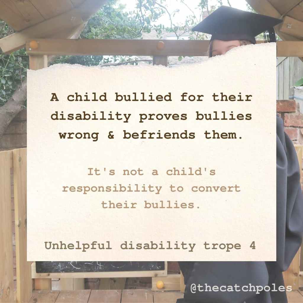 Image 5: ‘A child bullied for their disability proves bullies wrong & befriends them. It’s not a child’s responsibility to convert their bullies. Unhelpful disability trope 4’