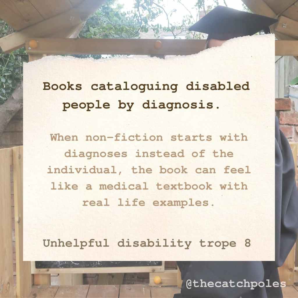 Image 9: ‘Books cataloguing disabled people by diagnosis. When non-fiction starts with diagnoses instead of the individual, the book can feel like a medical textbook with real life examples. Unhelpful disability trope 8’