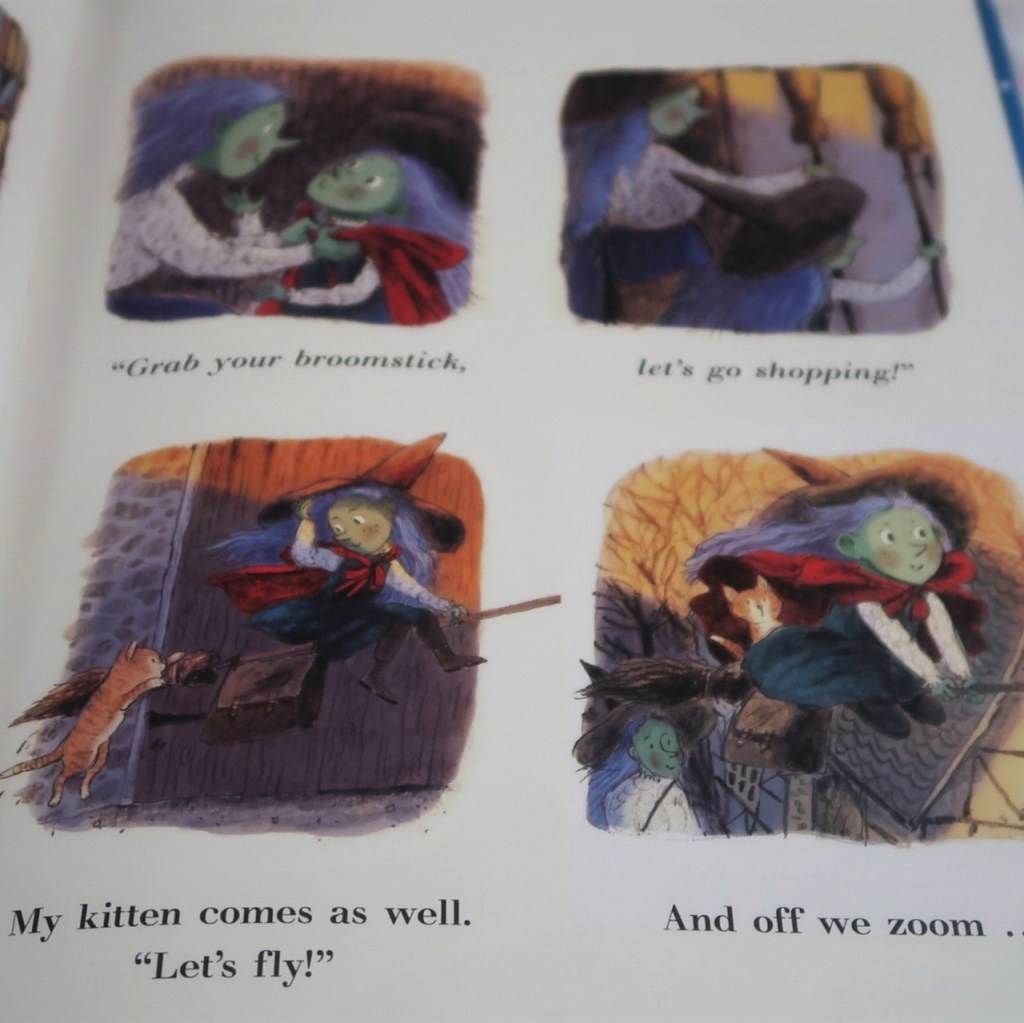 - 3 & 4 Consecutive pages from the book, showing a series of vignettes of the child witch getting ready, and then mother and daughter flying on their broomsticks.